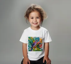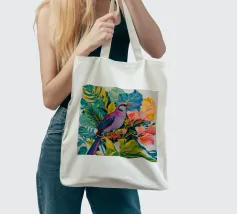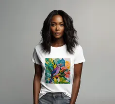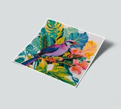 Questo dipinto mostra un vivace uccello appollaiato su un rigoglioso fogliame tropicale. Le piume dell'uccello sono un misto di viola e blu, ed è circondato da foglie verdi e fiori rosa. L'immagine cattura la bellezza e la diversità della fauna tropicale.