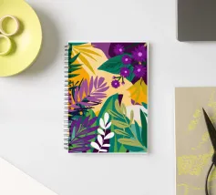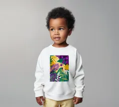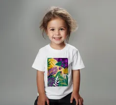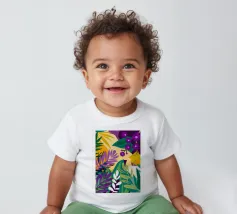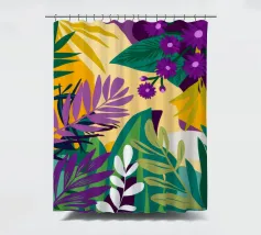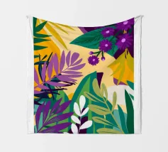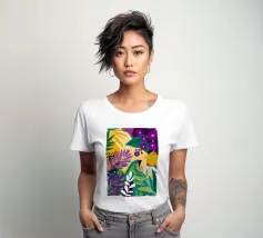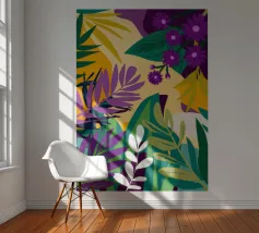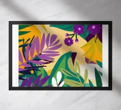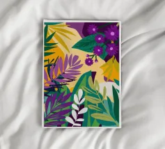 Una lussureggiante scena di giungla incornicia un grappolo d'uva viola, creando una natura morta unica e inaspettata che fonde il fogliame tropicale con la frutta del frutteto in una composizione vibrante.