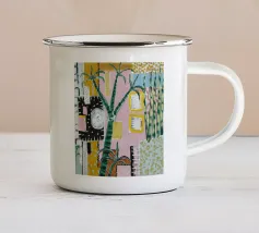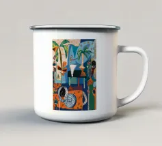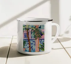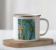 Questo dipinto raffigura una scena tropicale con palme e una barca a vela sullo sfondo. La combinazione di colori comprende tonalità di verde, blu e giallo, creando un'atmosfera serena e pittoresca.