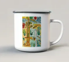 Un dipinto astratto colorato con varie forme e motivi, tra cui palme e disegni geometrici. La composizione dinamica crea un senso di movimento ed energia.