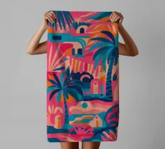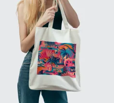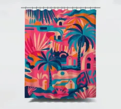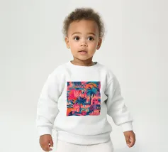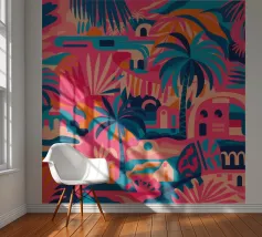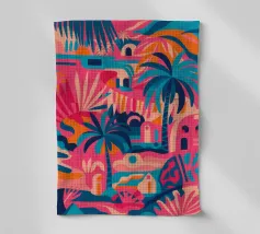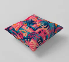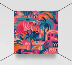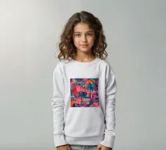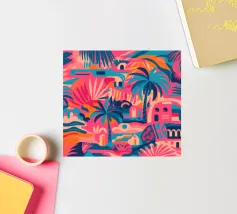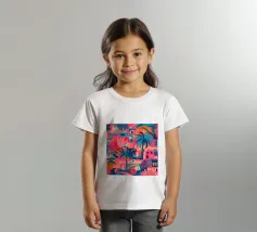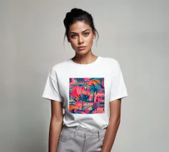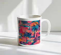 Un paesaggio tropicale vivace e colorato con palme, sole al tramonto e fogliame rigoglioso crea un'immagine vivida e idilliaca di una perfetta fuga in paradiso.