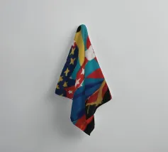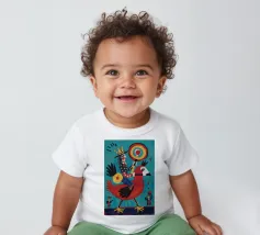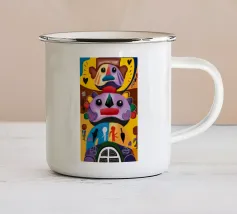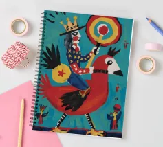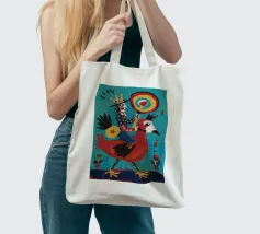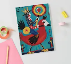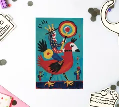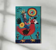 Un uccello coronato si trova su una piattaforma colorata, circondata da forme e simboli astratti che conferiscono all'opera un'atmosfera festosa e celebrativa.