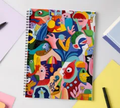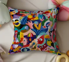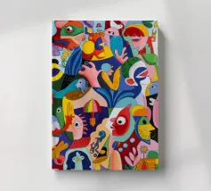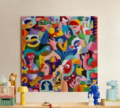 Una giocosa processione di creature fantastiche rese con colori vivaci e contrastanti. I tratti esagerati e le espressioni stravaganti aggiungono fascino ed energia alla disposizione caotica.