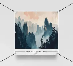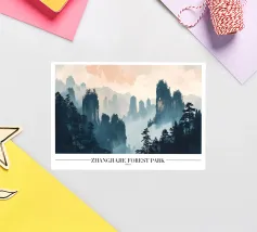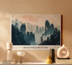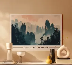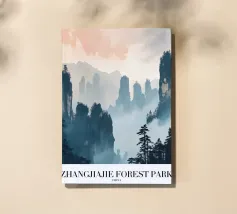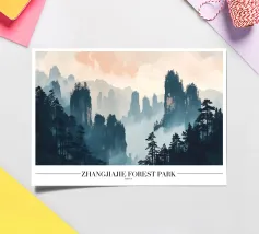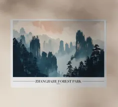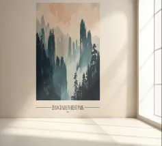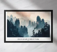 Immergetevi nel paesaggio etereo del Parco forestale di Zhangjiajie, in Cina, con questo poster digitale mozzafiato. L'opera d'arte raffigura gli iconici pilastri di arenaria avvolti da una nebbia atmosferica, sormontati da alberi scuri e verdeggianti. La scena evoca una qualità mistica e maestosa, che ricorda i tradizionali dipinti a inchiostro cinesi. Le scritte "ZHANGJIAJIE FOREST PARK" e "CHINA" sono elegantemente riportate in basso. Questa stampa digitale di qualità superiore, con una risoluzione di 7000x5000 pixel e 300 dpi, offre una nitidezza eccezionale e colori vivaci, perfetti per gli amanti della natura, gli avventurieri e gli appassionati di paesaggi unici.