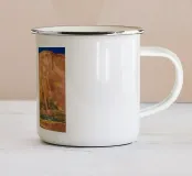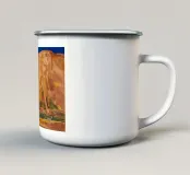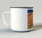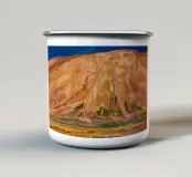 L'immensa parete marrone dorata di un canyon o di una scogliera riempie l'inquadratura, la sua superficie strutturata e la sua scala monumentale sono catturate con tratti espressivi sotto una scheggia di cielo blu intenso.