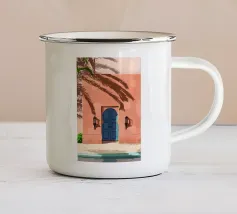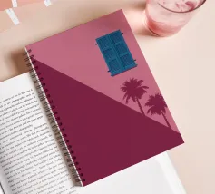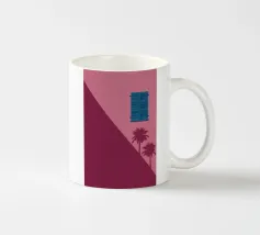 Una scena architettonica minimalista è caratterizzata da un muro rosa, una finestra con persiana blu e la sagoma di una palma, che crea una composizione serena, tranquilla ed esteticamente piacevole.