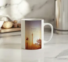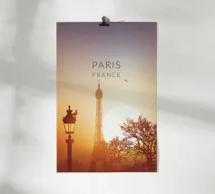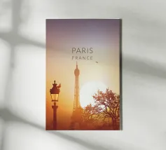 La Torre Eiffel, elemento centrale del disegno, è raffigurata in modo sottile ed elegante. I dettagli in rilievo sottolineano la bellezza e la grazia di questo monumento famoso in tutto il mondo. I colori tenui e caldi del sole al tramonto contrastano perfettamente con le linee scure della Torre Eiffel, rendendo questa stampa un insieme armonioso e romantico.