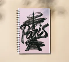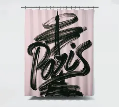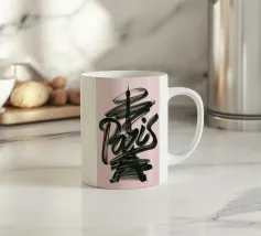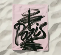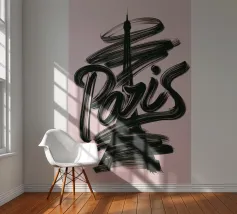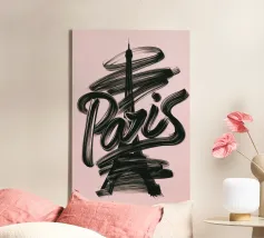 Questo poster moderno presenta la Torre Eiffel leggermente delineata dietro pennellate calligrafiche nere e dinamiche che scrivono "Paris" su uno sfondo rosa tenue.