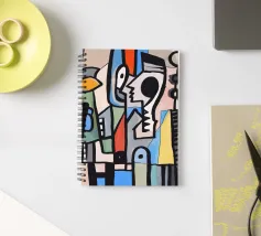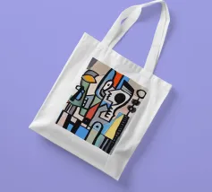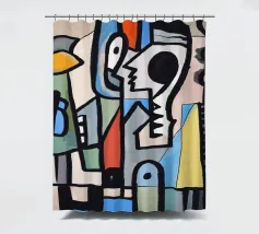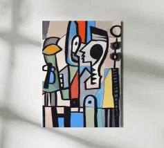 Una composizione astratta presenta un'accozzaglia di forme geometriche e contorni decisi in una varietà di colori. Alcuni elementi di questa miscela caotica assomigliano a volti e figure, creando un senso di forme nascoste in mezzo all'astrazione.