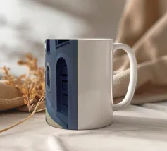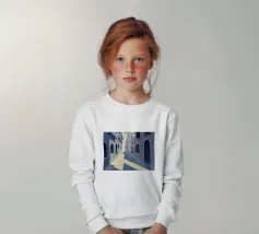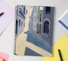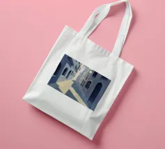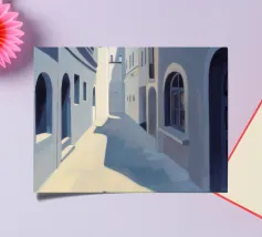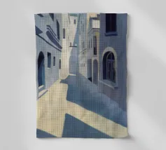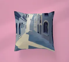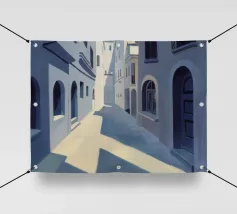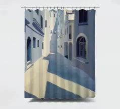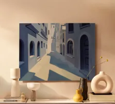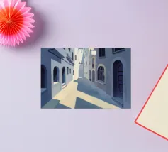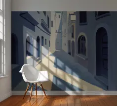 La luce del sole penetra in uno stretto e pittoresco vicolo di una città mediterranea, creando un netto contrasto tra luce e ombra. Le porte ad arco e le linee architettoniche pulite evocano un senso di bellezza pacifica e senza tempo.
