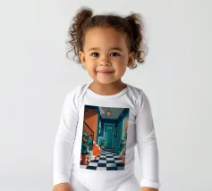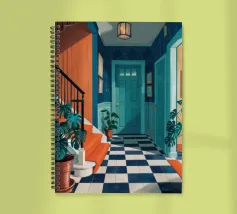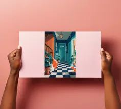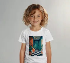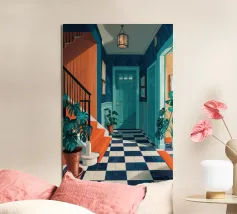 Illustrazione di un lungo ed elegante corridoio con pavimento a scacchi bianchi e neri e pareti color verde acqua. Piante in vaso fiancheggiano il passaggio, creando un'atmosfera serena, sofisticata e leggermente misteriosa.
