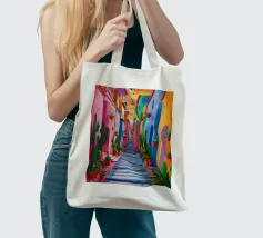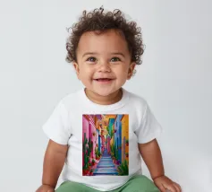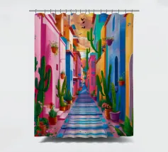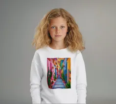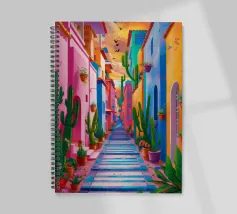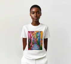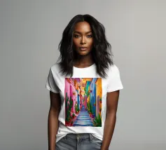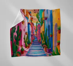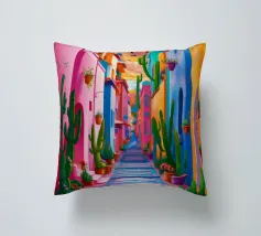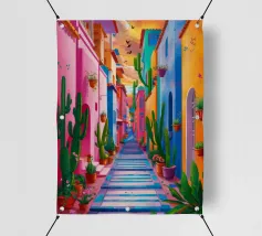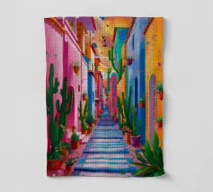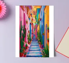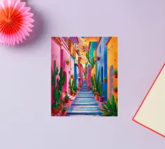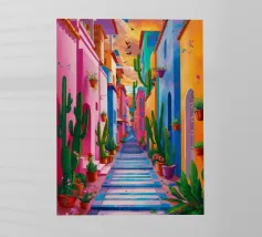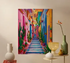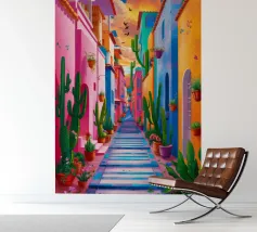 Un vicolo stretto e intensamente colorato, che ricorda un souk marocchino, con pareti rosa, gialle e arancioni, dettagli intricati e piante rigogliose che creano un'atmosfera magica.