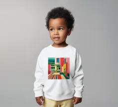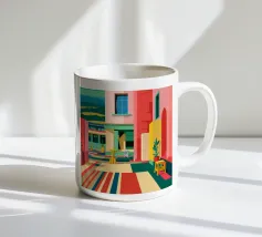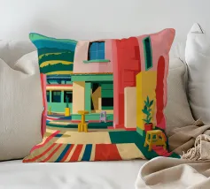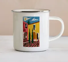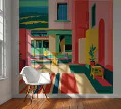 Una vista attraverso un cortile o un vicolo colorato con tappeti a righe sul pavimento e pareti vivaci. La scena è luminosa, invitante e architettonicamente interessante.