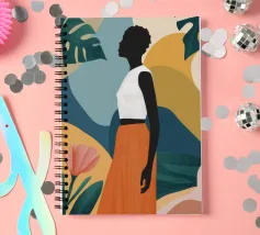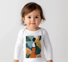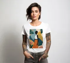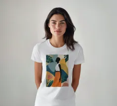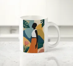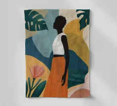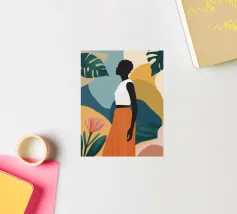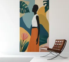 Illustrazione a figura intera di una donna con un elegante top bianco e una fluente gonna arancione, che cammina in un paesaggio astratto e frondoso. L'opera è elegante, moderna e cattura un senso di movimento aggraziato.
