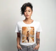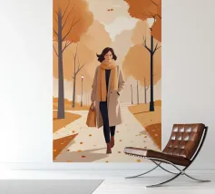 Un'illustrazione morbida e minimalista di una donna che cammina in un parco autunnale dorato. Le foglie che cadono e i toni caldi evocano nostalgia, riflessione e un accogliente fascino stagionale.