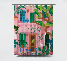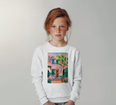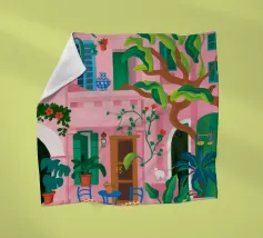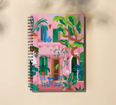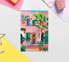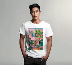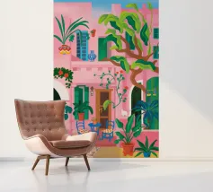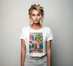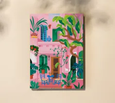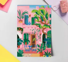 Un'illustrazione di una figura che cammina in un cortile vivace e illuminato dal sole, pieno di piante in vaso e fiori in fiore, con edifici dalle calde tonalità di terracotta, che evocano un'affascinante atmosfera mediterranea.