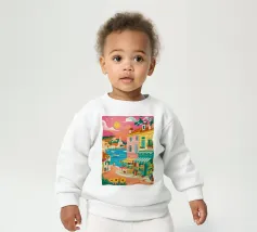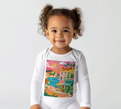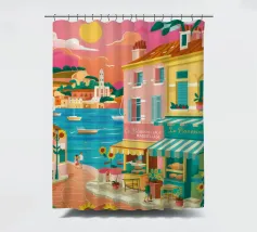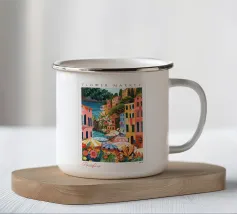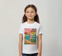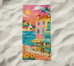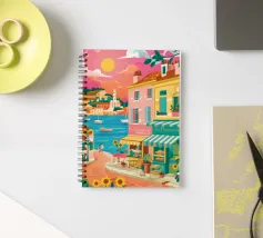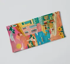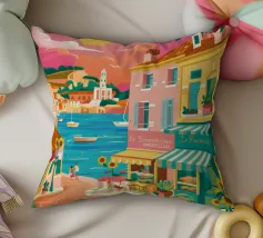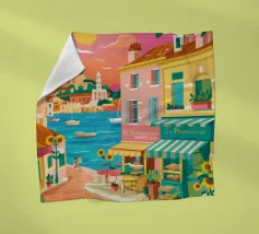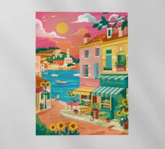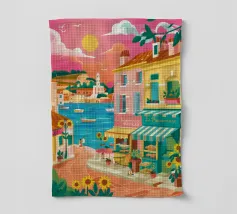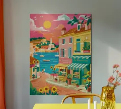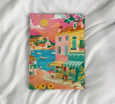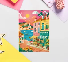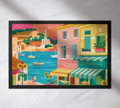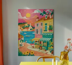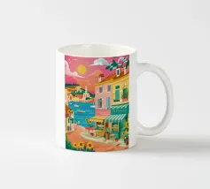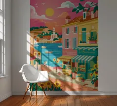 Una scena di strada energica e vivace in una città costiera, con edifici colorati in giallo e blu che scendono verso il mare sotto un sole luminoso e radioso.