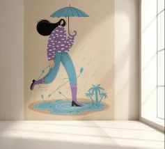 Una donna con l'ombrello cammina sotto la pioggia con un costume da bagno. La composizione è una rappresentazione affascinante, dinamica e leggermente malinconica della ricerca di gioia e movimento in una giornata di pioggia.