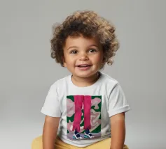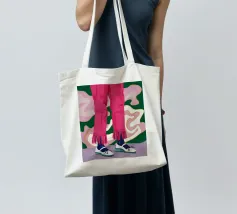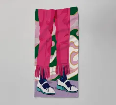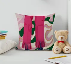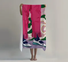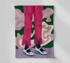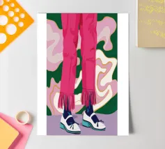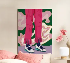 Un'illustrazione all'avanguardia incentrata sulle gambe di una persona che indossa pantaloni rosa acceso con dettagli di frange e scarpe da ginnastica bianche alla moda, trasmettendo movimento e sicurezza.