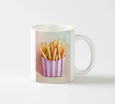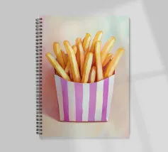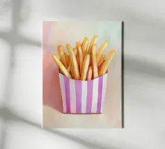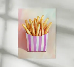 Questa affascinante illustrazione di patatine fritte in una scatola a righe viola cattura l'aspetto nostalgico e retrò del popolare snack. Con pennellate morbide e una tavolozza di colori armoniosa, l'opera trasmette una cultura alimentare giocosa e trasforma il fast food in arte culinaria creativa.