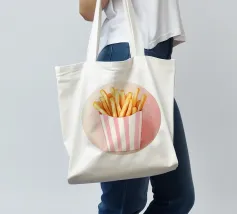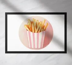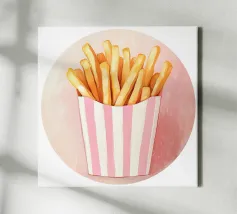 Questa affascinante stampa illustrativa di patatine fritte in una scatola a righe pastello cattura il nostalgico look retrò del popolare snack. Con pennellate morbide e una tavolozza di colori armoniosa, l'opera d'arte trasmette una cultura alimentare giocosa e trasforma il fast food in arte culinaria creativa.