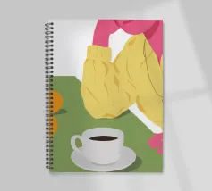 Vista dall'alto di una donna che si gode una tranquilla pausa caffè, con una tazza di caffè e un pasticcino su un piatto. La semplice composizione è una rappresentazione pacata, elegante e relazionabile di un momento tranquillo e personale.