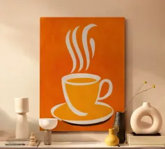Quest'opera d'arte cattura l'essenza di un caffè mattutino: La tavolozza di colori monocromatici in varie tonalità di arancione irradia calore ed energia e ricorda il sorgere del sole a colazione. La raffigurazione della tazza è astratta, con linee bianche fluide che formano sia il contorno della tazza che le nuvole di vapore. È un'ode alla semplicità e alla bellezza del quotidiano. La calda luminosità invita a fermarsi un attimo e a lasciarsi contagiare dall'ottimismo positivo e dal senso di sicurezza che emana questa immagine.