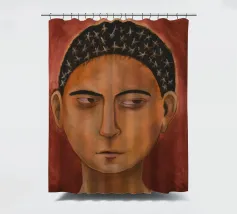 Un ragazzo con una calda camicia rossa contempla in silenzio, immerso in tonalità bronzee e semplicità grafica.