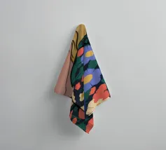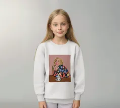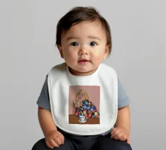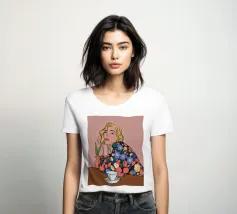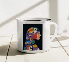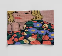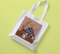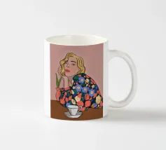Questa opera d'arte mostra una persona seduta a un tavolo con una tazza davanti a sé. La persona indossa un abito con un motivo floreale colorato e lo sfondo è di un caldo rosa, creando un'atmosfera accogliente e riflessiva.