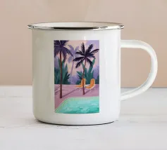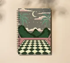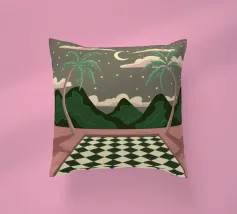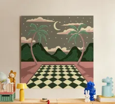 Una vista attraverso un arco di un pavimento a scacchi che conduce a una terrazza con palme sotto un cielo stellato notturno. La scena è una rappresentazione serena, elegante e magica di una tranquilla serata tropicale.
