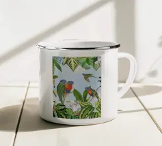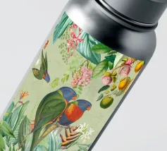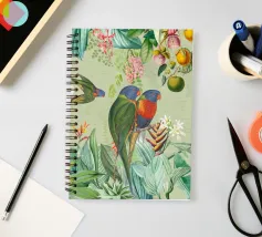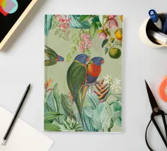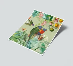 Questo vivace collage vintage presenta splendidi pappagalli posizionati al centro, le cui piume brillanti nei toni del verde, del blu e del rosso creano un punto focale dinamico. I pappagalli si appollaiano con grazia tra il lussureggiante fogliame tropicale, il cui piumaggio vivace contrasta meravigliosamente con le foglie vibranti e i fiori esotici circostanti. Lo sfondo, ammorbidito da un tocco vintage, esalta l'atmosfera da paradiso tropicale. La composizione, giocosa e al tempo stesso elegante, cattura lo spirito vivace della natura, fondendo la presenza sorprendente dei pappagalli con la serena bellezza dei tropici in un modo nostalgico e senza tempo.