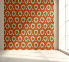 Elegante stampa astratta di piume di pavone di ispirazione rétro in arancione bruciato, rosso, beige e verde menta.