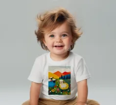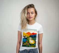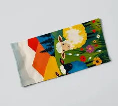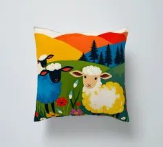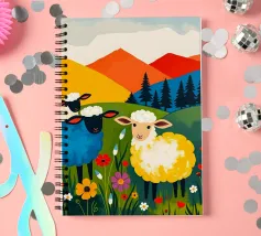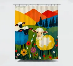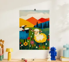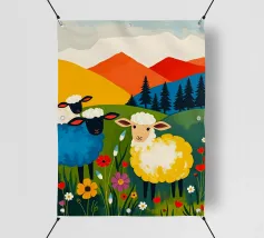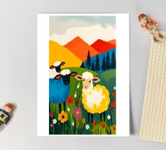 Simpatiche pecore colorate in un campo con fiori selvatici e montagne sullo sfondo.