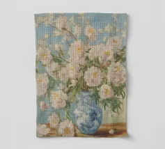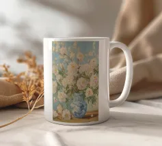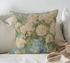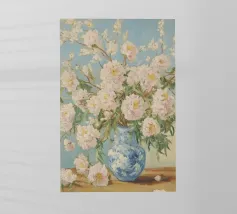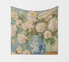 Dipinto a olio di lussureggianti peonie bianche disposte in un vaso bianco e blu a cineseria. Natura morta floreale impressionista con colori pastello tenui su uno sfondo azzurro, che cattura la delicata consistenza delle fioriture primaverili.