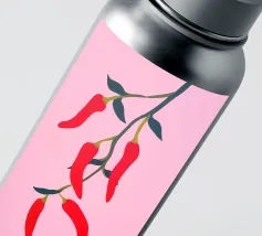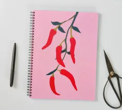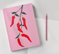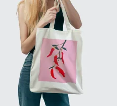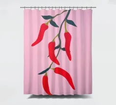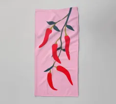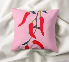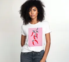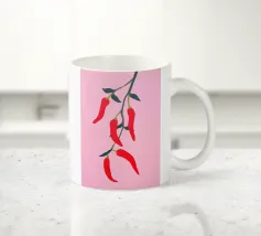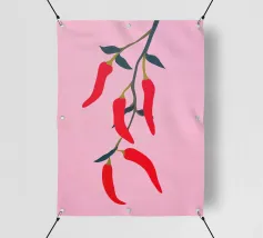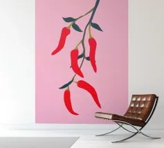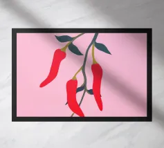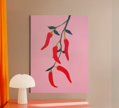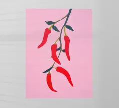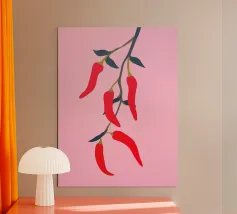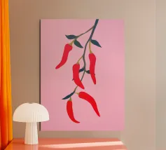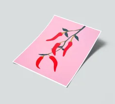 Questa illustrazione minimalista mostra peperoncini rossi brillanti che pendono da un ramo e risplendono su uno sfondo rosa. Il design semplice ma moderno conferisce all'opera un fascino culinario.