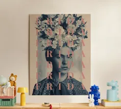 un tentativo di ritratto floreale monocromatico contemporaneo e surreale per Frida. Collage floreale digitale con tipografia