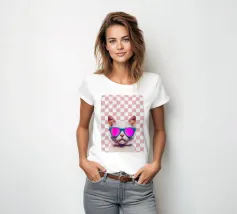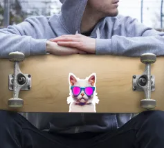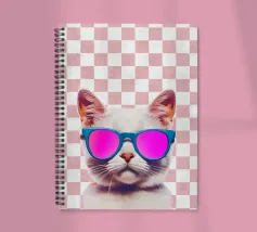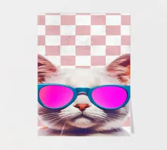 Un elegante gatto bianco che sfoggia audaci occhiali da sole su uno sfondo a scacchiera rosa di tendenza. Fresca, sicura di sé e senza sforzo chic, quest'opera d'arte conferisce un'estetica giocosa e moderna a qualsiasi spazio.