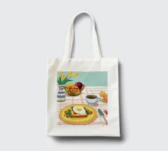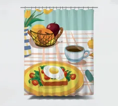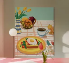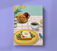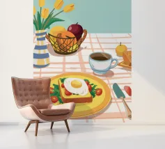 Un'affascinante illustrazione di un uovo al sole perfettamente cotto e di una fetta di avocado toast, con una tazza di caffè vicino, che cattura la colazione ideale.