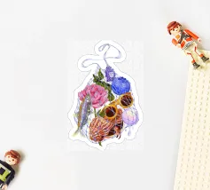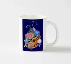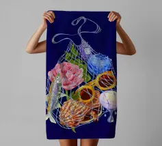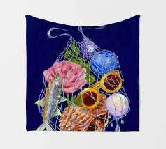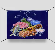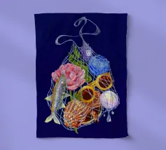 Fisherman Haul è un'illustrazione stravagante di un campionario di vacanze al mare, solo l'essenziale in una borsa bilum con i brillantini, per un'evasione perfetta!