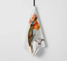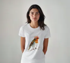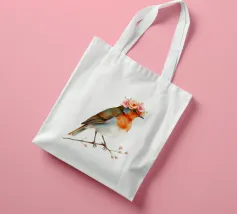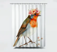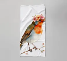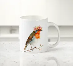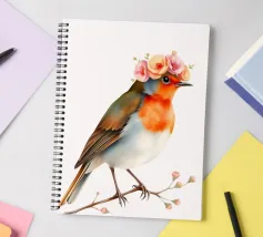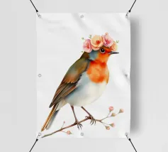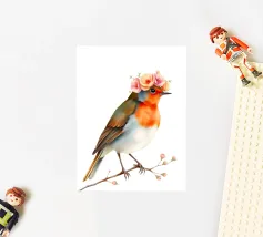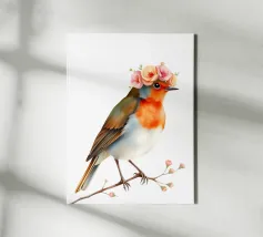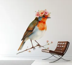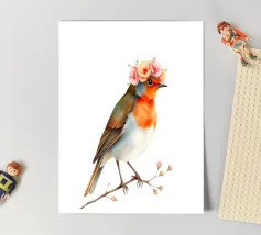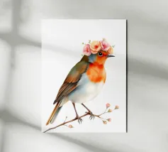 Simpatico ritratto di animale di un pettirosso con corona di fiori appollaiato su un ramo.