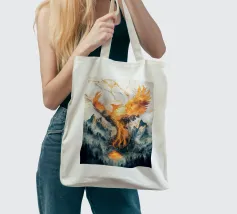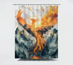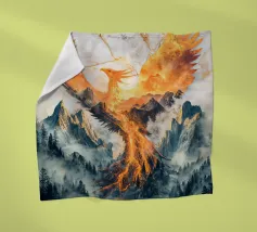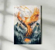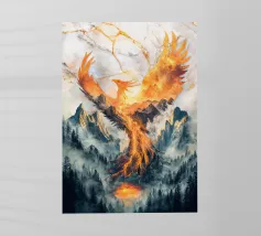 una fenice erutta da cime frastagliate come un vulcano. Le sue fiamme fuse si riversano in una nebbiosa pineta e in un lago incandescente, mentre il cielo infuocato si infiamma di rinascita.