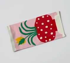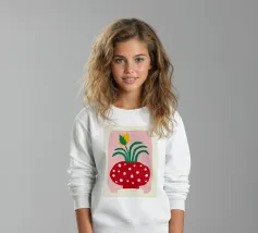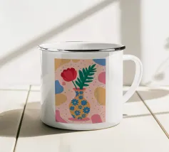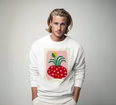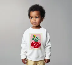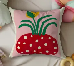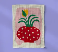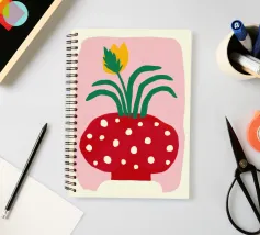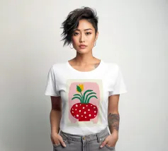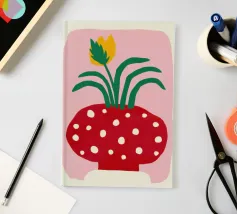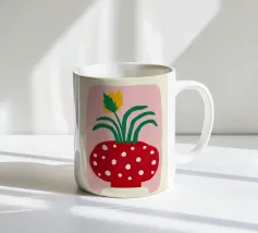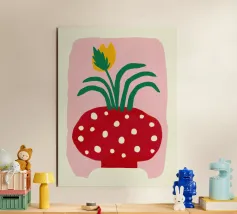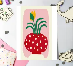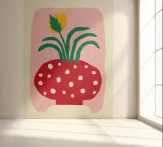 Un'illustrazione allegra e grafica di una grande pianta verde in un vivace vaso rosso ornato da pois bianchi. Su uno sfondo rosa tenue, questo pezzo è una rivisitazione moderna e giocosa dell'arte botanica.
