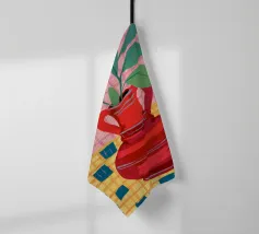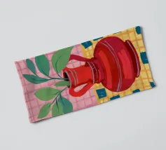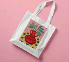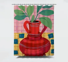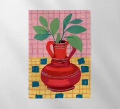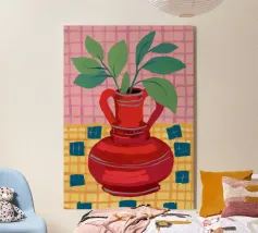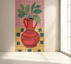 Natura morta di una pianta verde e frondosa in un vaso di terracotta rossa, su un pavimento a scacchi colorati. La combinazione di vasellame rustico, fogliame rigoglioso e motivi grafici crea una composizione unica e moderna.