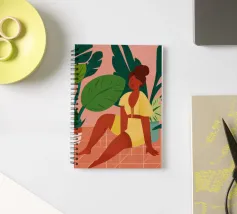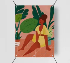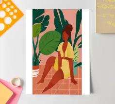 Ritratto di una donna con un top giallo, circondata da una rigogliosa giungla di piante d'appartamento. La scena è una vibrante, gioiosa e bellissima celebrazione di una donna orgogliosa e felice delle piante nel suo santuario.