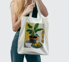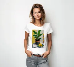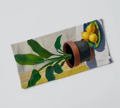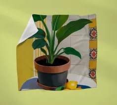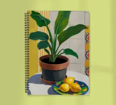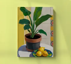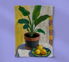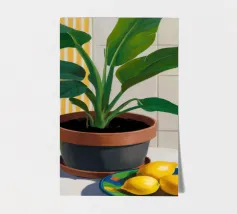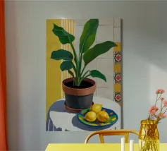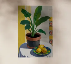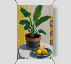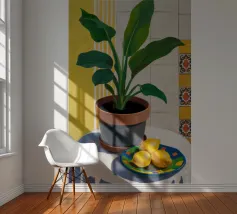 Una bellissima natura morta di un albero di limoni in vaso con uno sfondo piastrellato. La composizione è una rappresentazione fresca, pulita ed elegante dell'arredamento di ispirazione mediterranea.