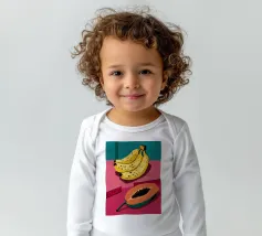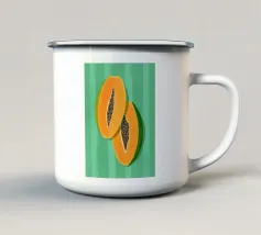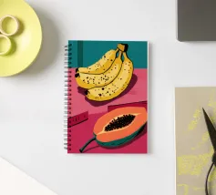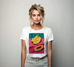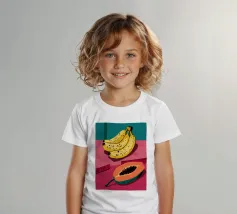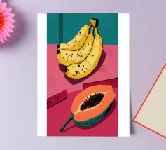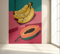 Un'illustrazione audace e ispirata alla pop art di banane e papaya su un piatto rosso brillante. I colori ad alto contrasto e lo stile grafico creano una dichiarazione vibrante e giocosa.