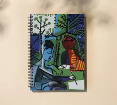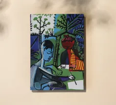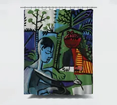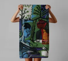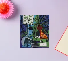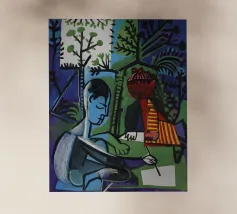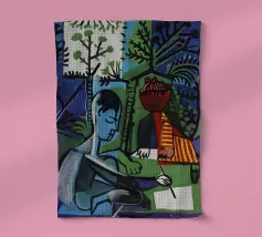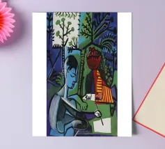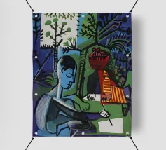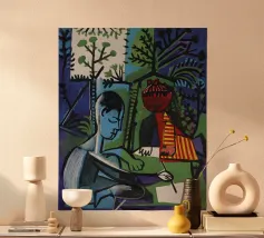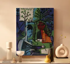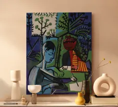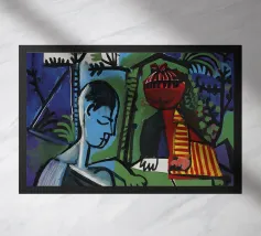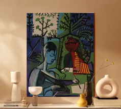 Immergetevi ne "Il pittore e la sua modella" di Pablo Picasso, un'opera cubista vivida e dinamica che esplora il processo creativo. Il dipinto raffigura un artista seduto, reso in blu e grigi freddi, impegnato a disegnare, mentre una vibrante modella vestita di rosso sta dietro. Le linee audaci, le forme frammentate e l'intensa tavolozza di colori su uno sfondo di fogliame stilizzato esemplificano l'approccio innovativo di Picasso alla ritrattistica e ai temi artistici. Il nostro poster digitale di alta qualità, con una risoluzione di 7000x5000 pixel e 300 dpi, riproduce in modo impeccabile ogni singolo tratto espressivo, offrendo un'eccezionale qualità di immagine.