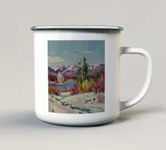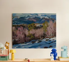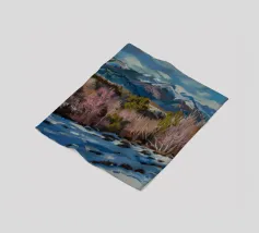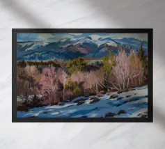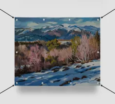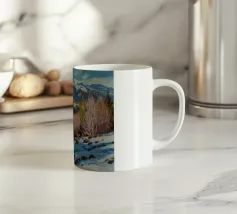 Un paesaggio aspro, caratterizzato da un fiume veloce e roccioso che si fa strada in un'ampia vallata, le cui sponde sono fiancheggiate da alberi spogli o scarsamente frondosi, che conducono verso uno sfondo di imponenti montagne innevate.