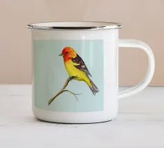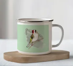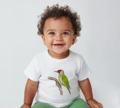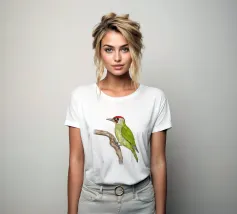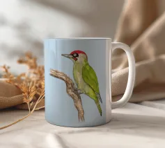 Disegno ad acquerello di un picchio verde seduto sul ramo di un albero. L'uccello si vede di lato. Guarda con un occhio solo. Lo sfondo è stato aggiunto digitalmente.