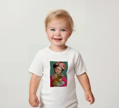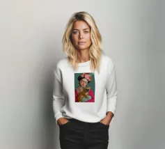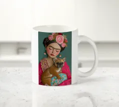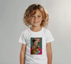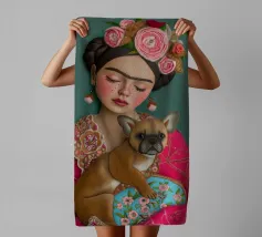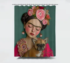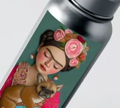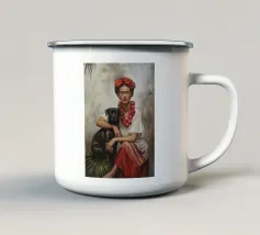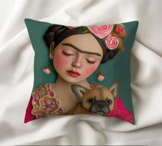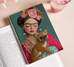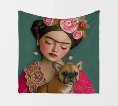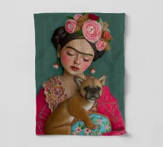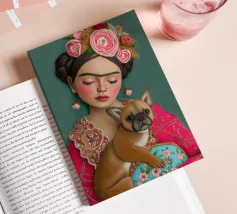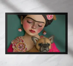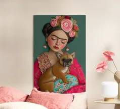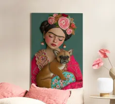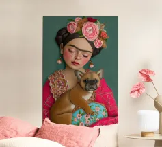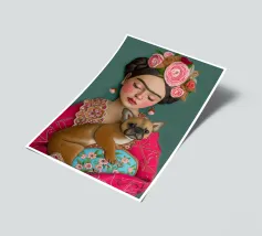Frida Kahlo indossa la sua caratteristica corona di fiori e le sopracciglia decorate, mentre irradia un'atmosfera sognante con gli occhi chiusi. L'opera, completata dal suo cane e da elementi folcloristici, cattura l'essenza della vita di Frida in un collage creativo di colori e texture.